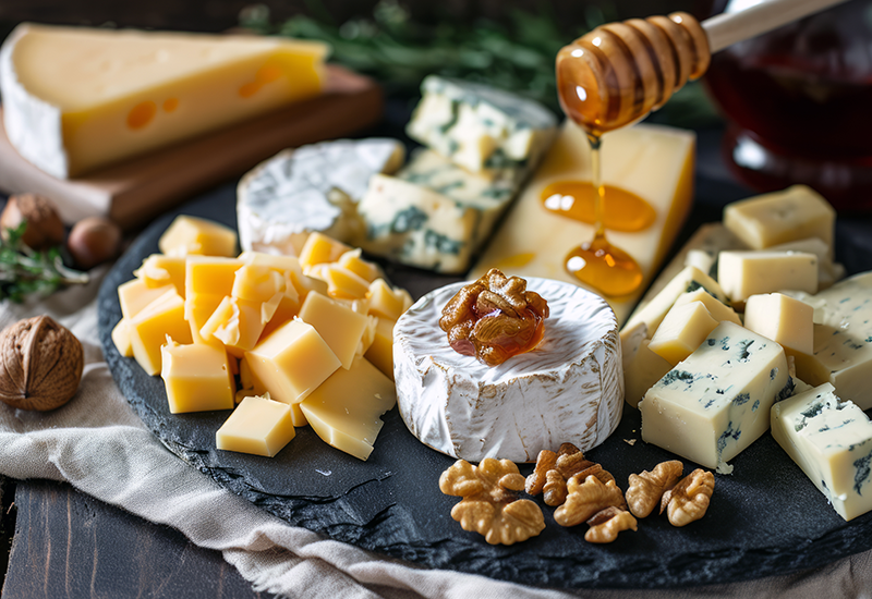 Probier z. B. Brie, Ziegenkäse und Blauschimmelkäse mit Honig, Feigenpaste und Senf. Notiere, welche Kombination am besten harmoniert.